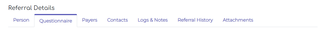 Referral Details screen that allows you to view and input details about the person as they relate to the service being requested through the referral. Each service may have it's own set of information defined in the Questionnaire; some required, some not. These configurations were defined through the course of onboarding your organization into the system.