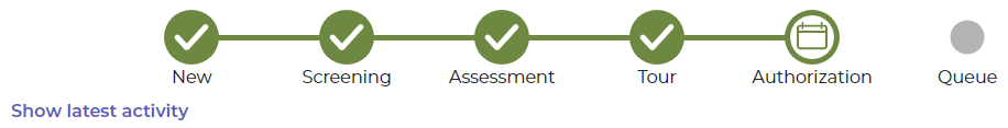 Beneath the Intake Progress Bar, you can click the Show latest activity link to see highly detailed information about the history of the referral. Certain items on this history, depending on the nature of the item, are able to be clicked into to view and edit the actual feature related to the item. All items can be hovered over to view even more granular information.