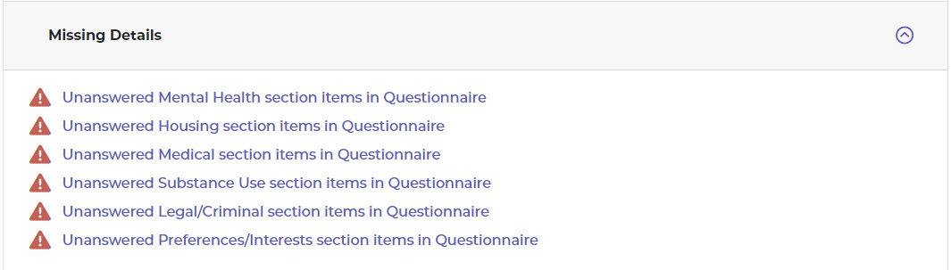 from the person's record or the Questionnaire. As information for the person's record and the Questionnaire are gathered entered, these items will disappear from this section. |